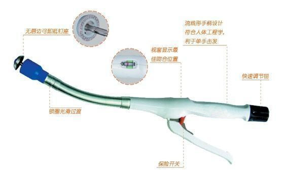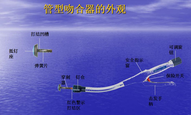消化道吻合器,一次性管型吻合器是在组织、器官上击入成圆形排列的两排互相交错的缝钉,并同时以环形刀将其内侧的组织切断。应用该器械可以节省手术时间、减少病员出血、能更方便地进行手术缝合。本器械有六种规格以适应不同组织。